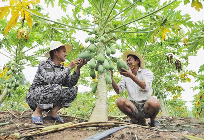 Migrants pleasantly work before temporary resettlement houses